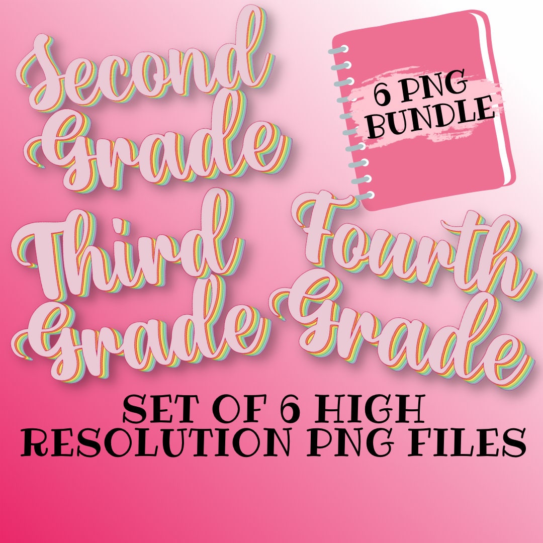 Welcome to our vibrant collection of digital PNG files! This listing features a fantastic 6-pack of 3D echo text designs, each representing a grade from kindergarten to fifth grade. These colorful layers are arranged in a mesmerizing rainbow pattern, adding a delightful touch to your projects.