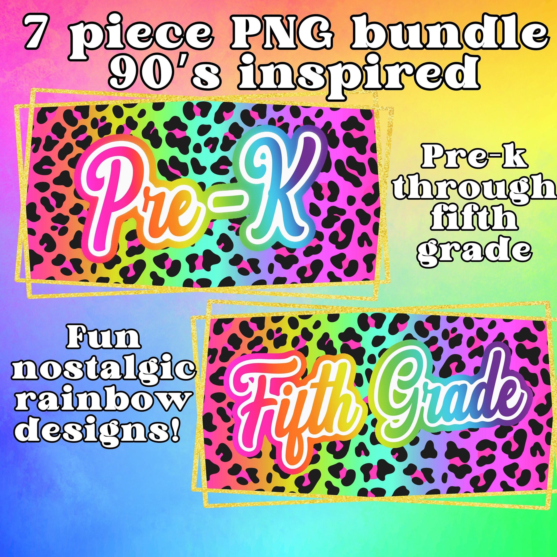 Welcome to our delightful collection of Lisa Frank-inspired digital images! This PNG bundle brings you a vibrant and enchanting combination of rainbow colors and whimsical leopard print, all adorned with a cheerful rainbow text. Each image represents a different grade, starting from "pre-k" and taking you all the way through fifth grade.