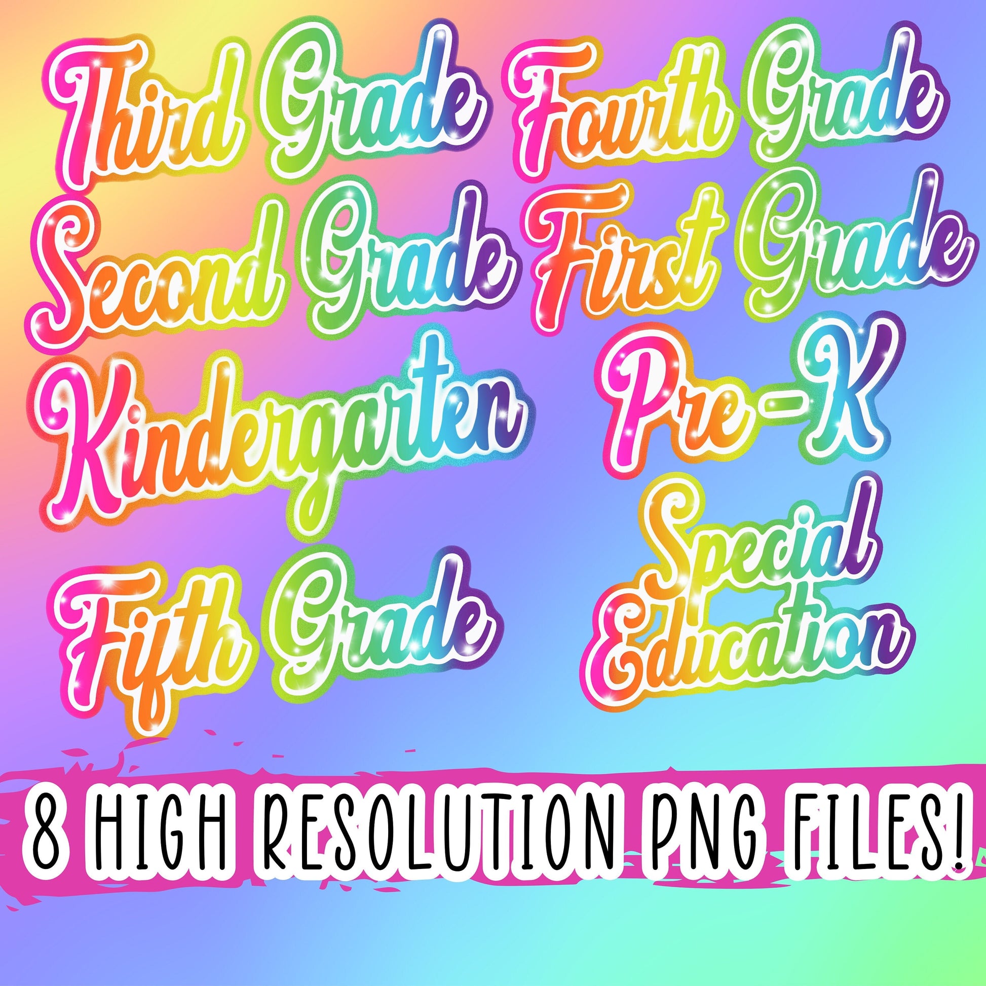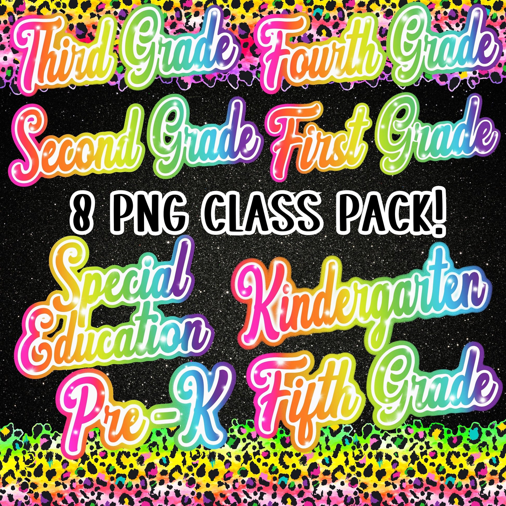 Back To School Lisa Frank inspired 8 PNG Bundle grade level Kindergarten 1st grade special ed rainbow sparkle glitter Teacher Sublimation