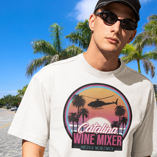 For those who remember the iconic Catalina Wine Mixer scene, featuring a bold and playful font and bright, beach sunset colors, this shirt is a summer must have!