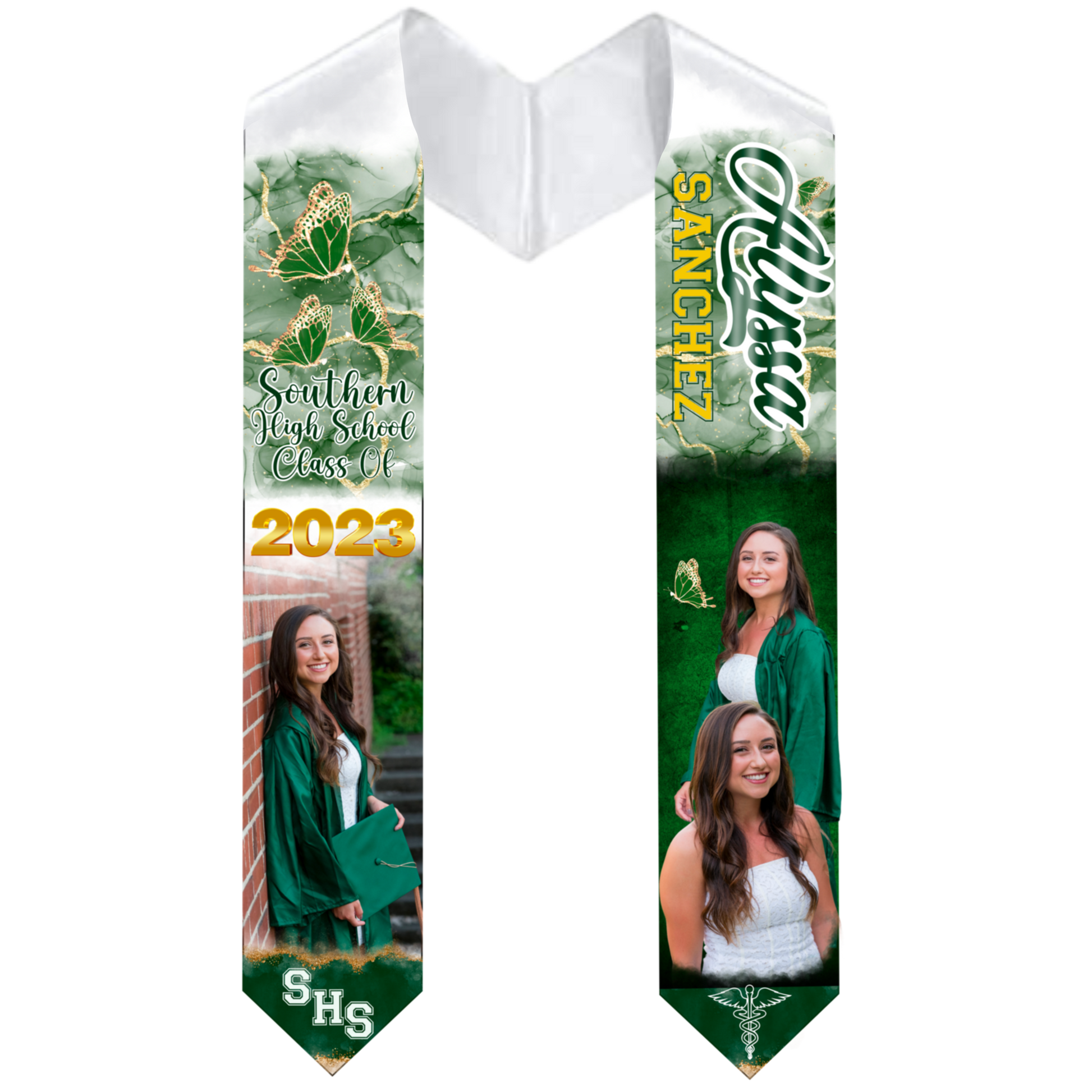 Celebrate your graduate with a uniquely designed stole featuring photos, colors and design elements reflecting their own personality! Stole is 72" total, 36" on each side. Please copy & paste the questions in the Google form (link below) along with best quality photos possible- and email to orders@lionandladybugprinting.com with your last name and order number in the subject line. This will provide details to assist with your design- all further questions and proof approvals will be emailed, only approved designs will go to production and shipped.