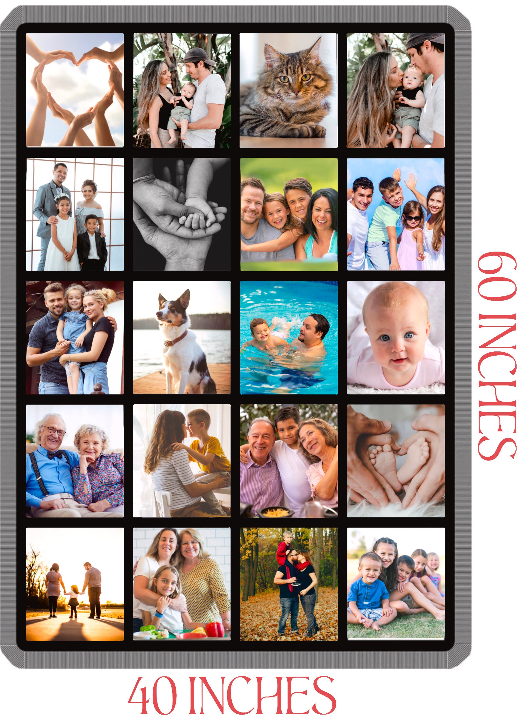 Introducing our 40" x 60" Customizable Photo Blanket, a unique and cherished way to display your most treasured memories. This personalized blanket is designed with versatility in mind, featuring 20 spaces that can be adorned with your favorite photos or text. It is crafted with the utmost care and attention to detail, ensuring a high-quality product that will bring warmth and comfort to your home.