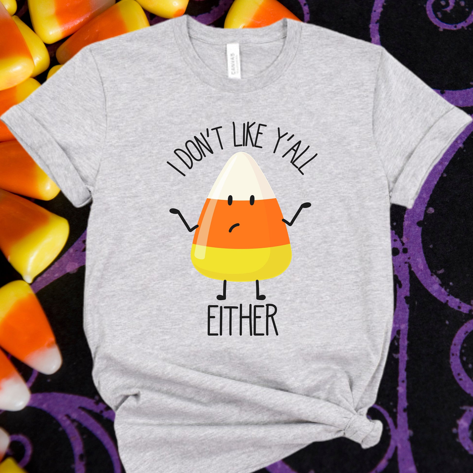 Funny Halloween T-shirt - Candy Corn Shrug - "I Don't Like Y'all Either" - Humorous Halloween Tee - Unisex Fit
