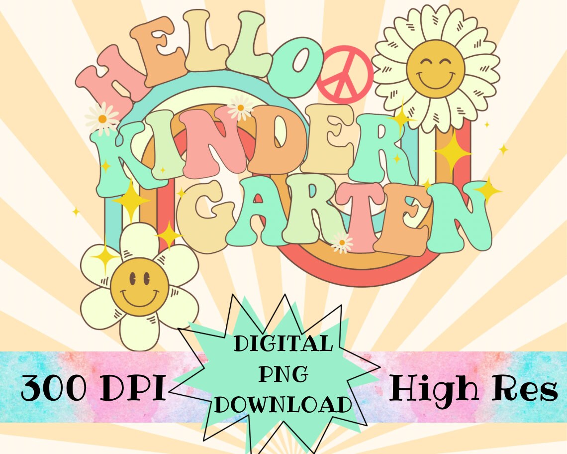 Hello Kindergarten Retro Font Digital PNG File Back to school retro rainbow smiley sunshine instant digital download for teacher kids shirts
