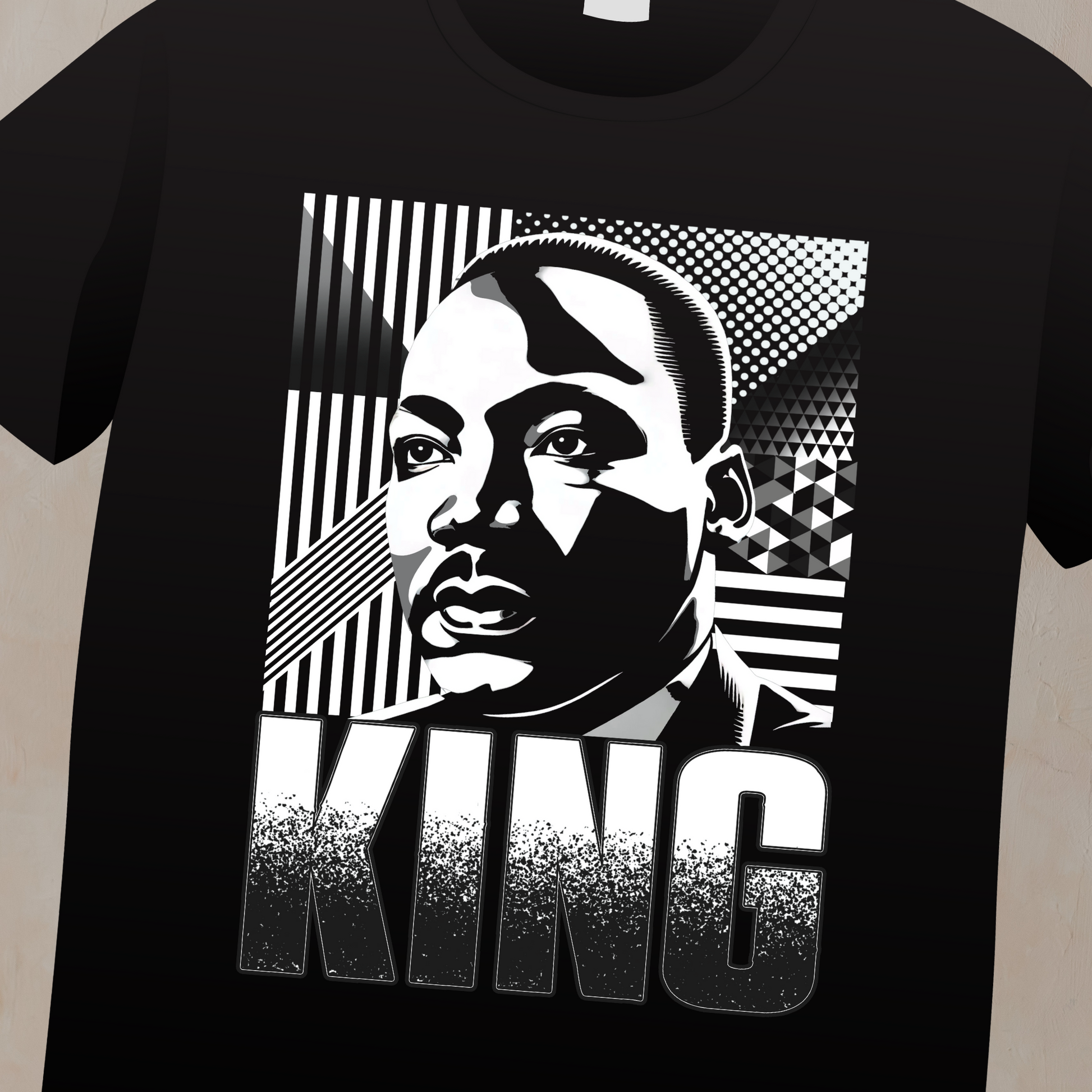 This “KING” T-shirt pays homage to the enduring legacy of Dr. Martin Luther King Jr. Featuring a striking black-and-white portrait with bold geometric patterns in the background, this design exudes timeless sophistication and strength. The textured gradient effect on the word “KING” adds a dynamic edge, making it a standout piece for any wardrobe. Perfect for celebrating Black history, social justice, and leadership, this T-shirt is a powerful reminder of resilience and hope. Crafted from high-quality materials, it offers both comfort and durability, making it ideal for everyday wear or special events.