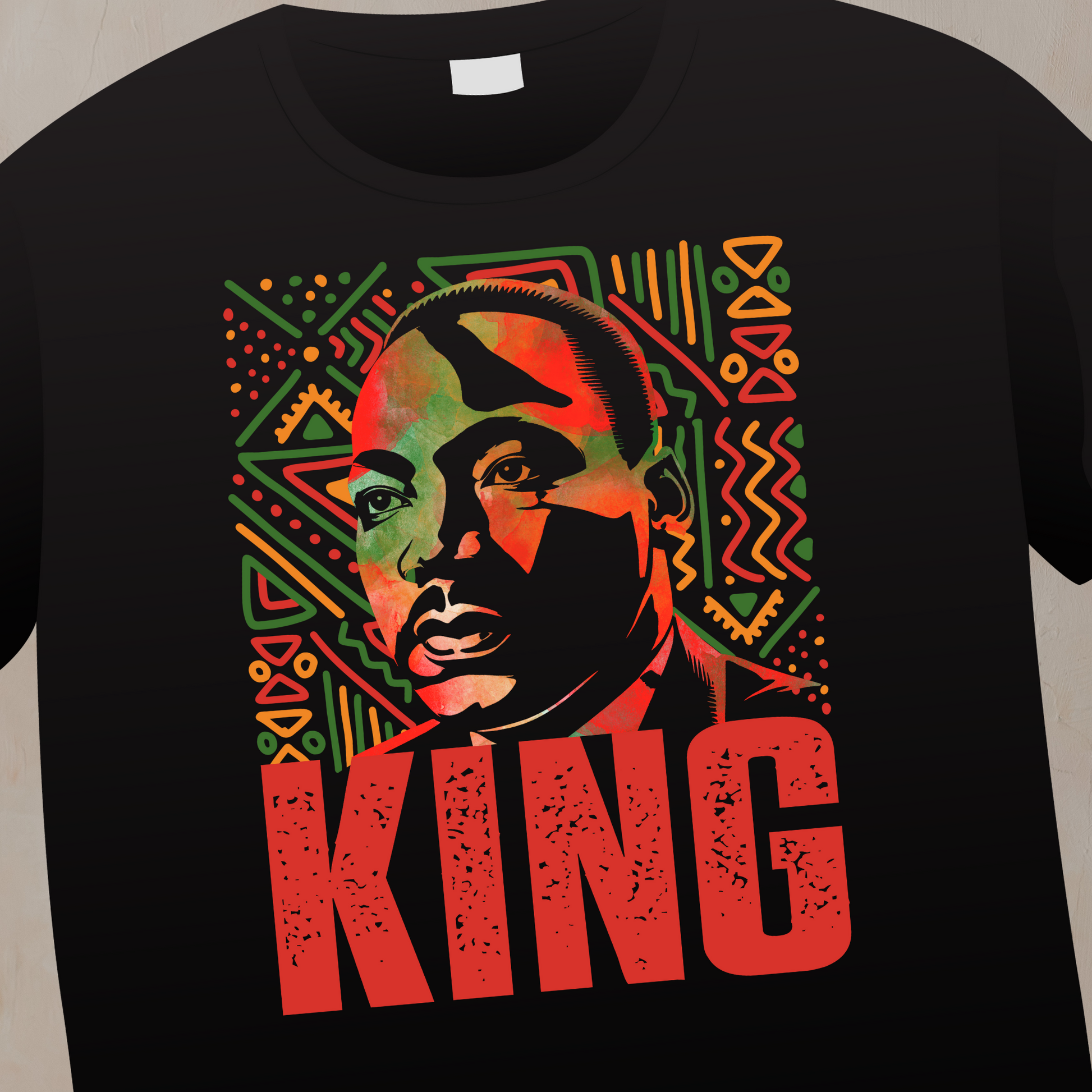 Celebrate the legacy of Dr. Martin Luther King Jr. with this vibrant and bold T-shirt. Featuring a striking portrait of Dr. King set against an Afrocentric pattern in red, green, and gold tones, the design radiates pride and empowerment. The powerful “KING” text in bold red beneath the image adds a commanding presence, making this shirt both stylish and meaningful. Perfect for honoring Black history, social justice, and leadership, this T-shirt is a statement of resilience and hope. Crafted with high-quality materials, it’s comfortable, durable, and perfect for everyday wear or special events.