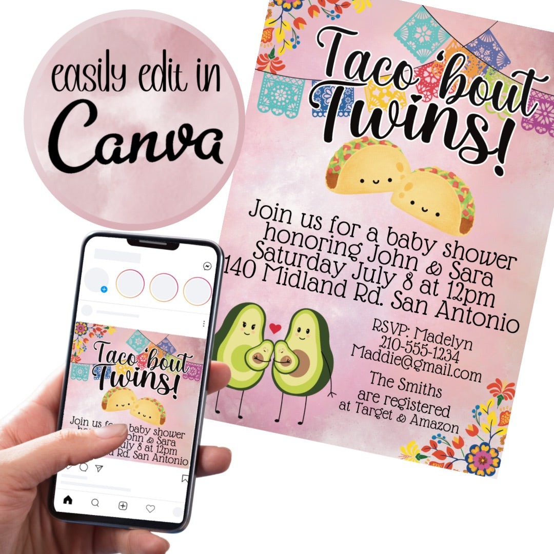 Two is better than one when it comes to tacos and babies! Celebrate the impending arrival of twins with this fun taco-themed invitation. Make your shower unforgettable with the perfect mix of cheesy puns and excitement! So, “Taco bout” a good time!